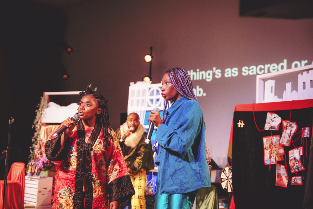 Through Dawn, Afternoon, Dusk, and Night, three characters contend with the arrival of a cataclysmic event: the “Boom.” The work offers a complex take on contemporary conditions marked by polarizing rhetoric, authoritarian structures, and the looming threat of human extinction. The characters — Necyria, Orachrysops, and Bicyclus, and the Auctioneer — are based on archetypes associated with the animistic qualities ascribed to fire, earth, air, and the void. Each character contends with their own definition of power, whether it be natural , authoritarian propaganda, dissociative technology, or the spectacle of consumerism. Carnelian asks when we will recognize that the “Boom” is already here, and how does our humanity endure through these existential threats?
